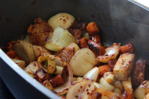 - In der Zwischenzeit das Gemüse putzen, grob würfeln und mit etwas Öl im Bräter zusammen mit dem Tomatenmark anrösten.